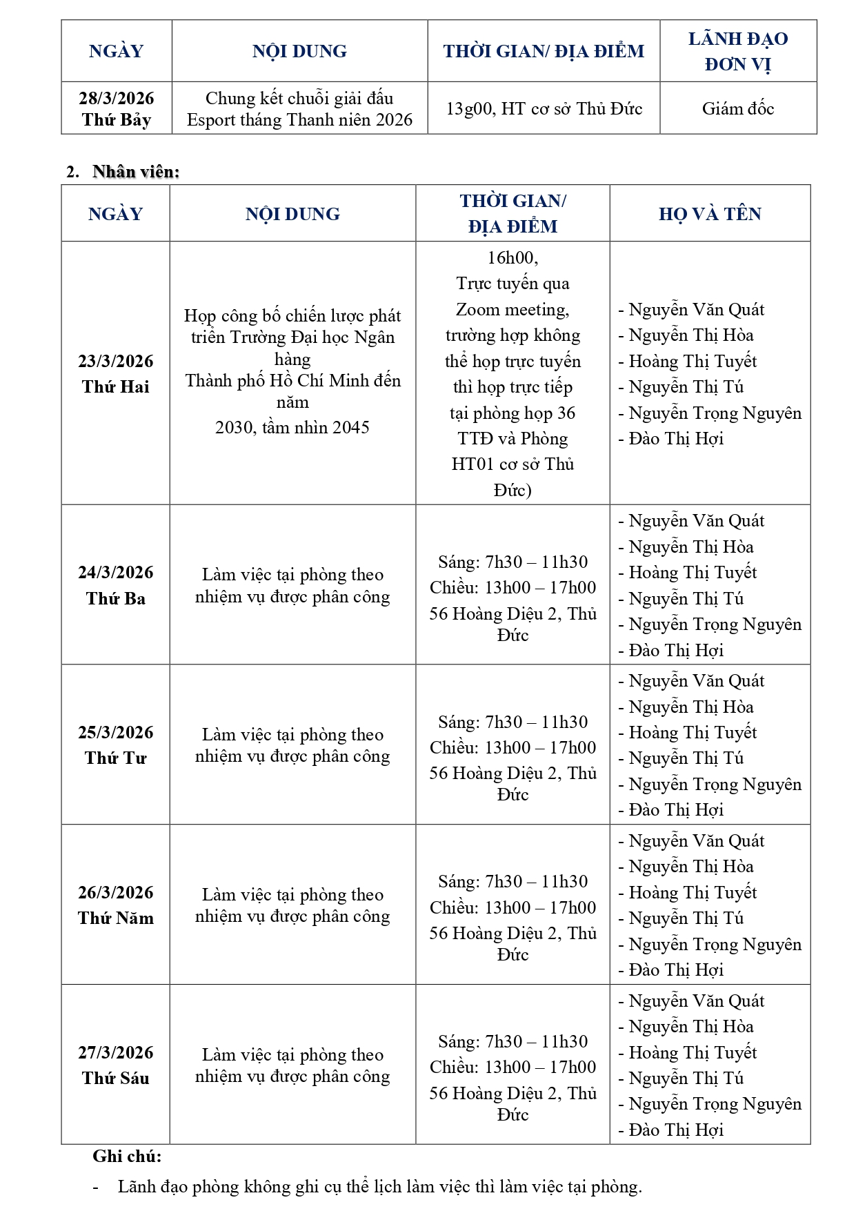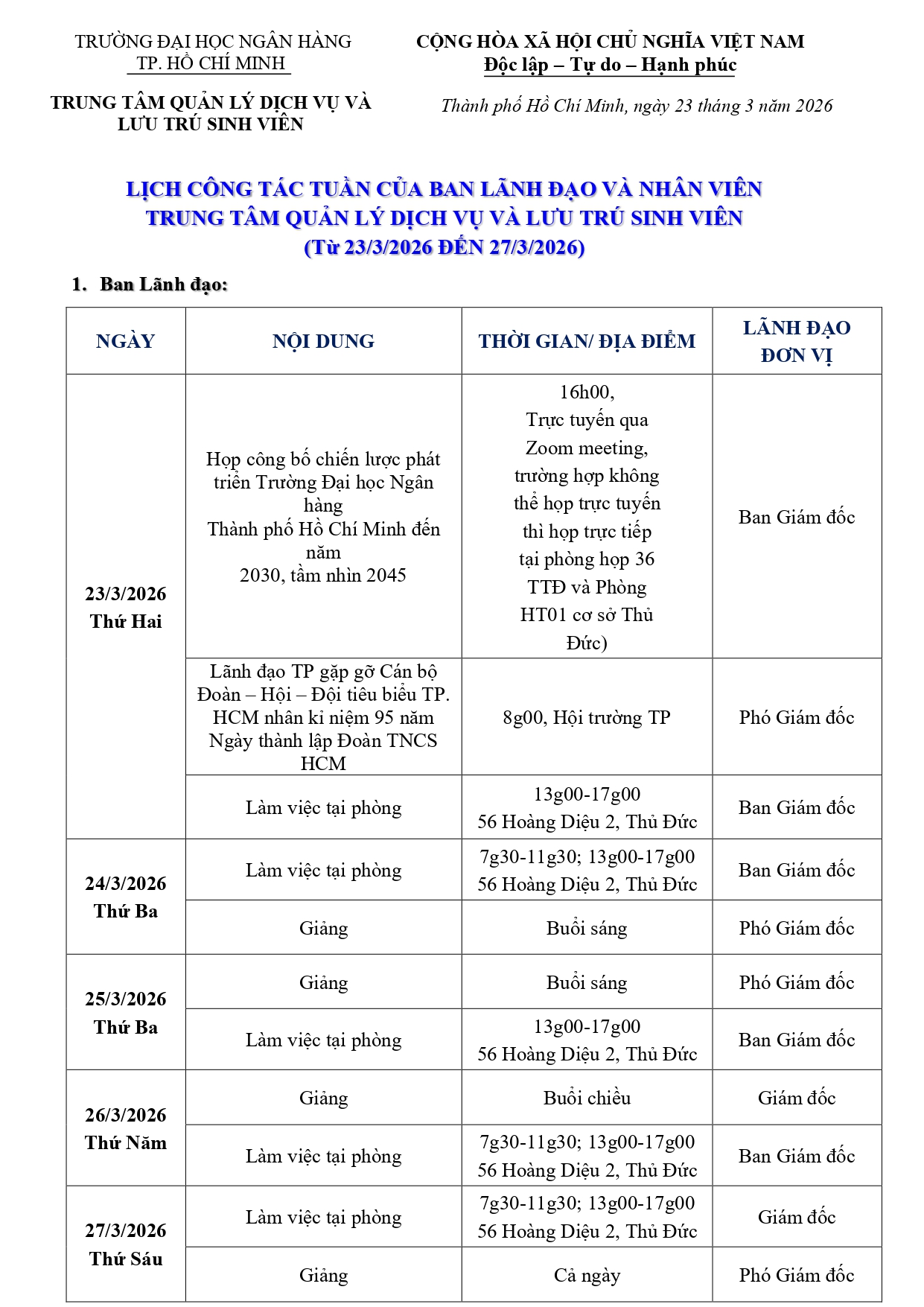 Lịch công tác tuần 12 từ ngày 23/03/2026 đến hết ngày 27/03/2026