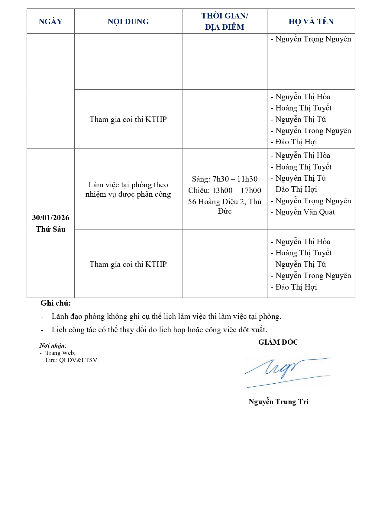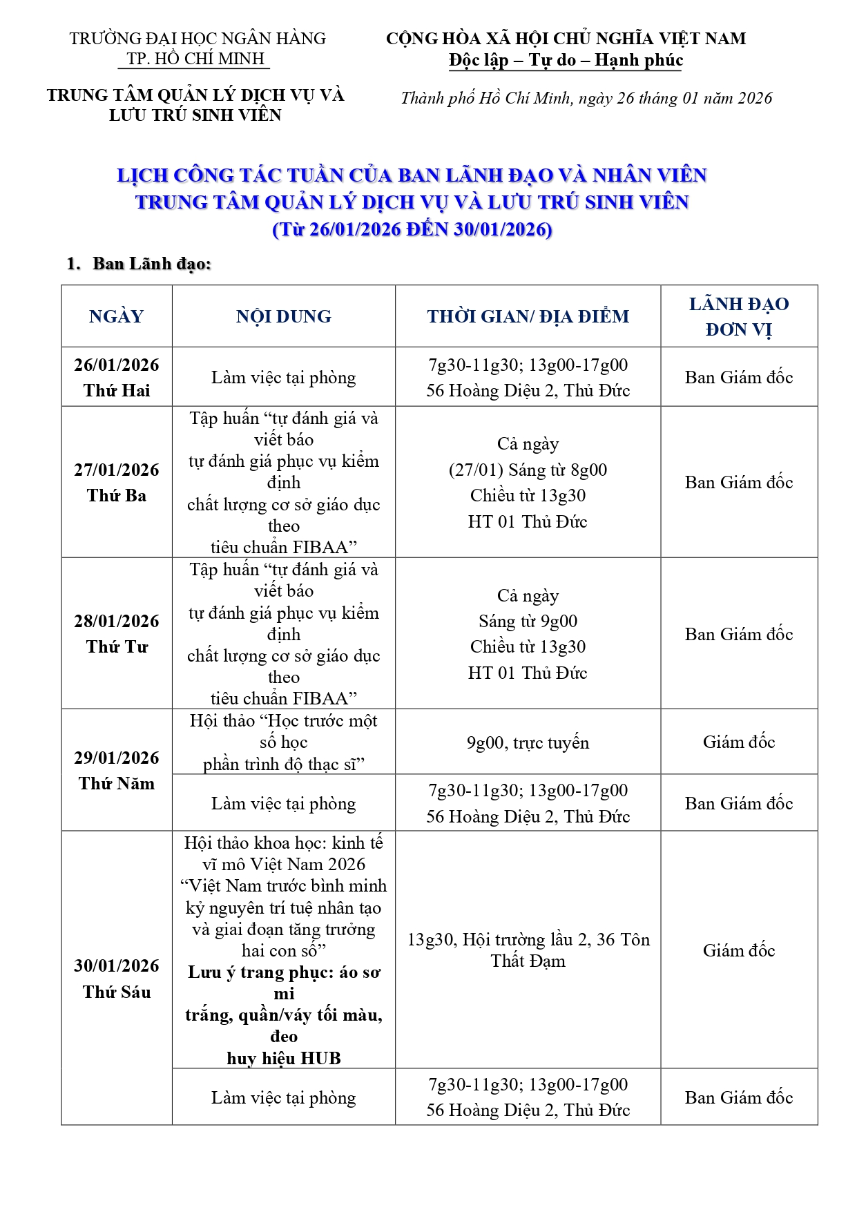 Lịch công tác tuần 4 từ ngày 26/01/2026 đến hết ngày 30/01/2026