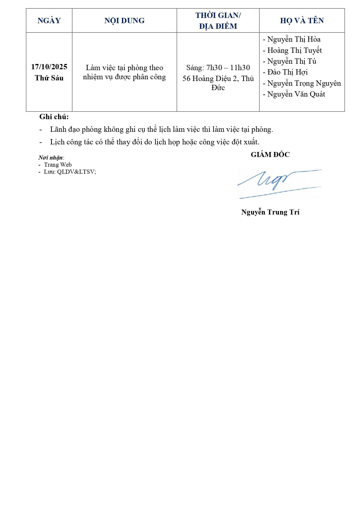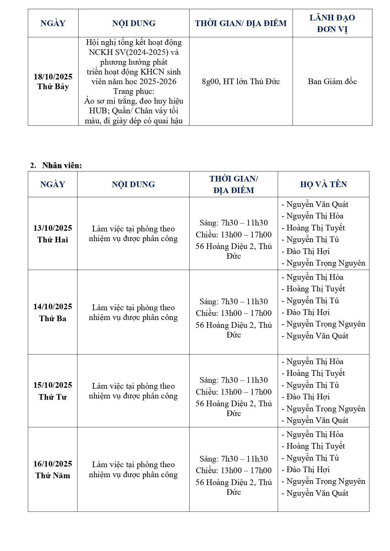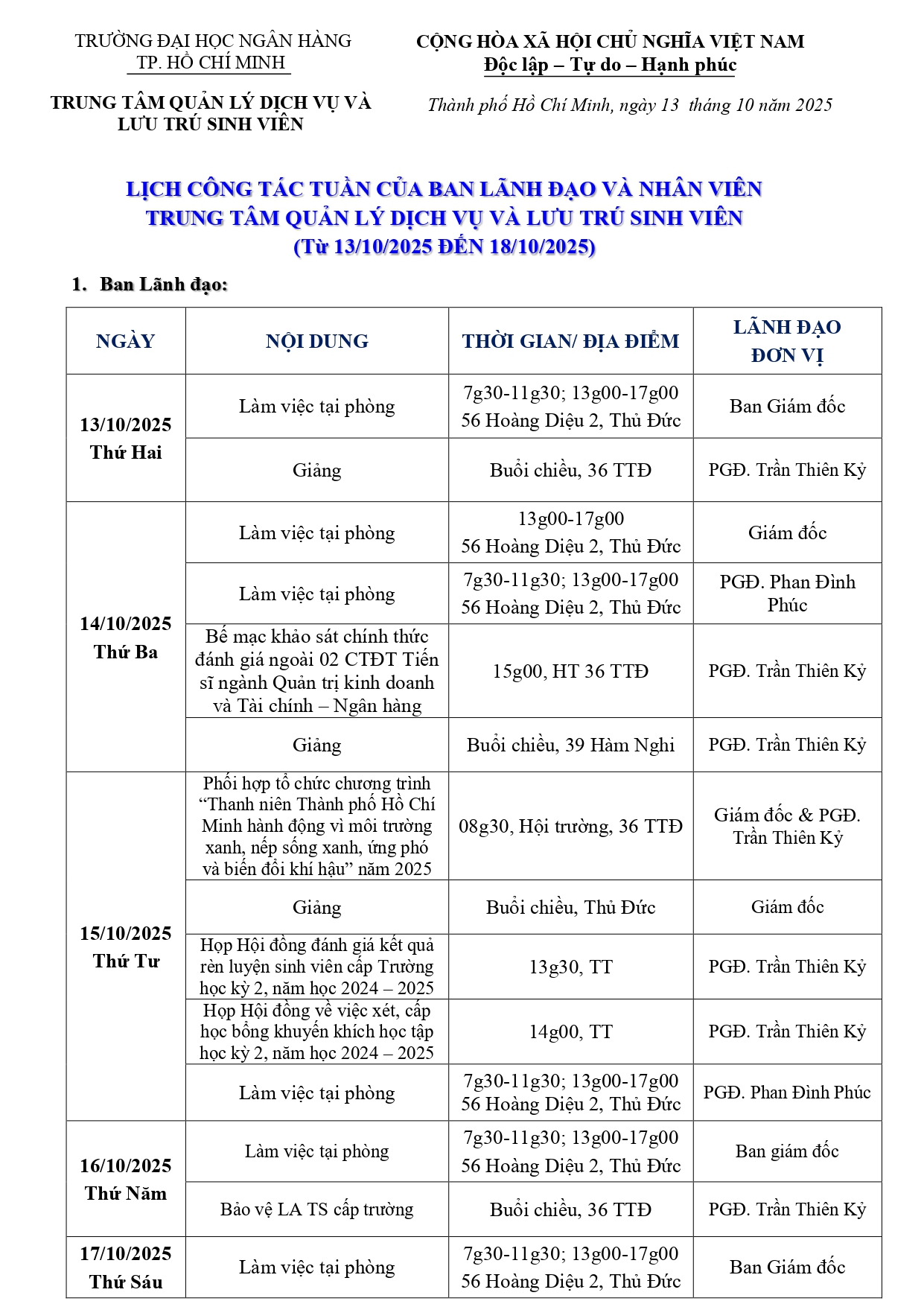 Lịch công tác tuần 40 từ ngày 13/10/2025 đến hết ngày 17/10/2025