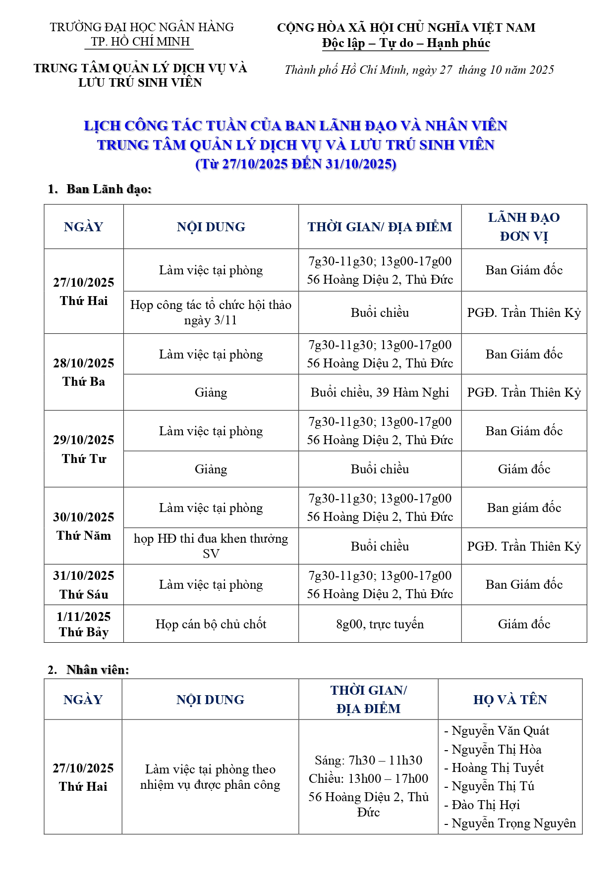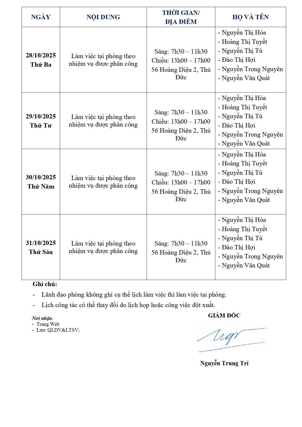 Lịch công tác tuần 42 từ ngày 27/10/2025 đến hết ngày 31/10/2025