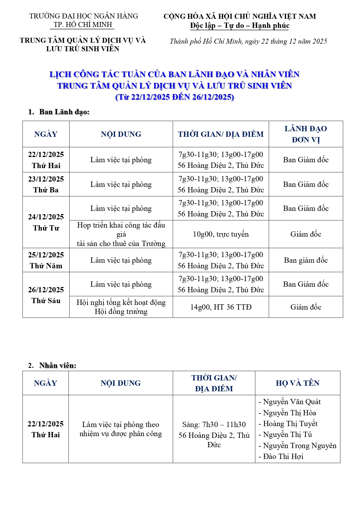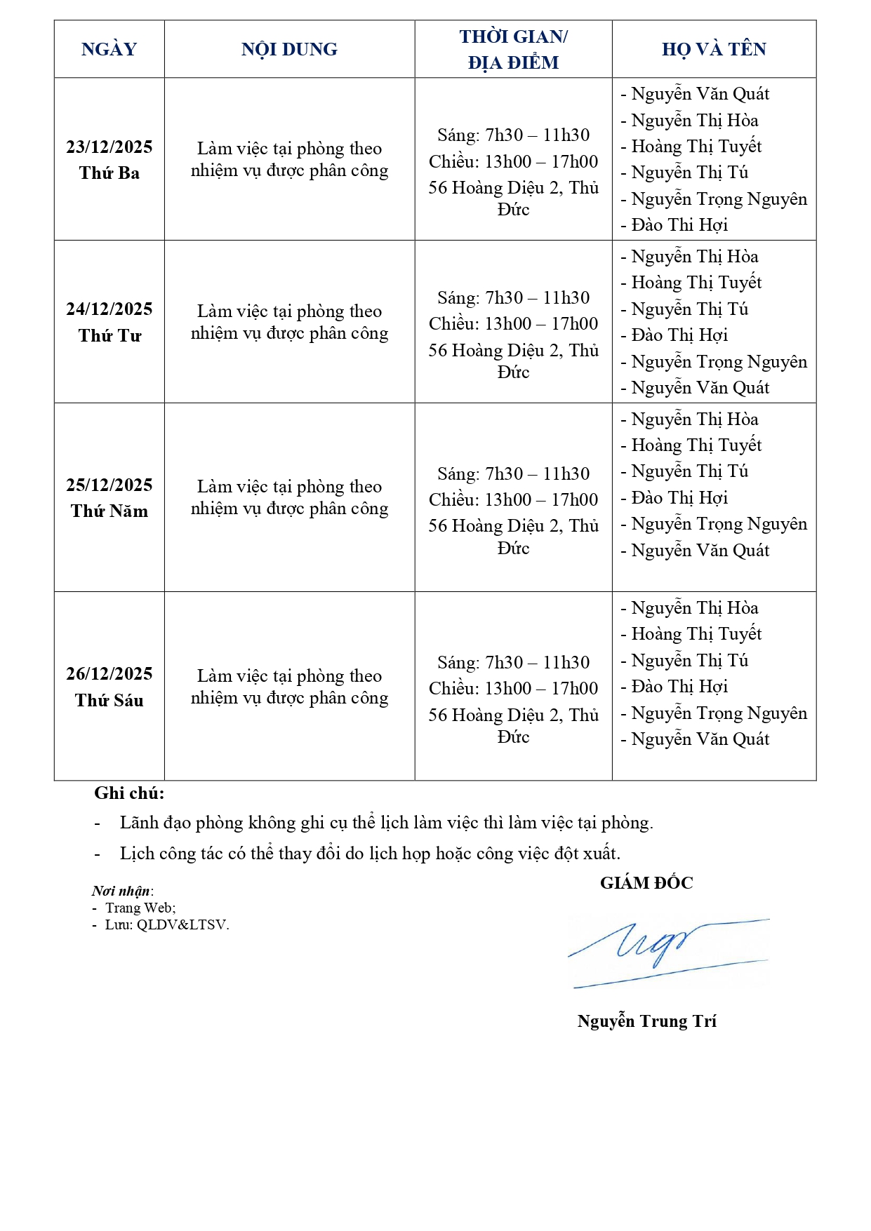 Lịch công tác tuần 50 từ ngày 22/12/2025 đến hết ngày 26/12/2025
