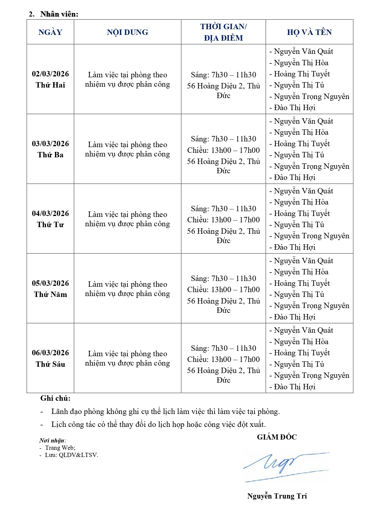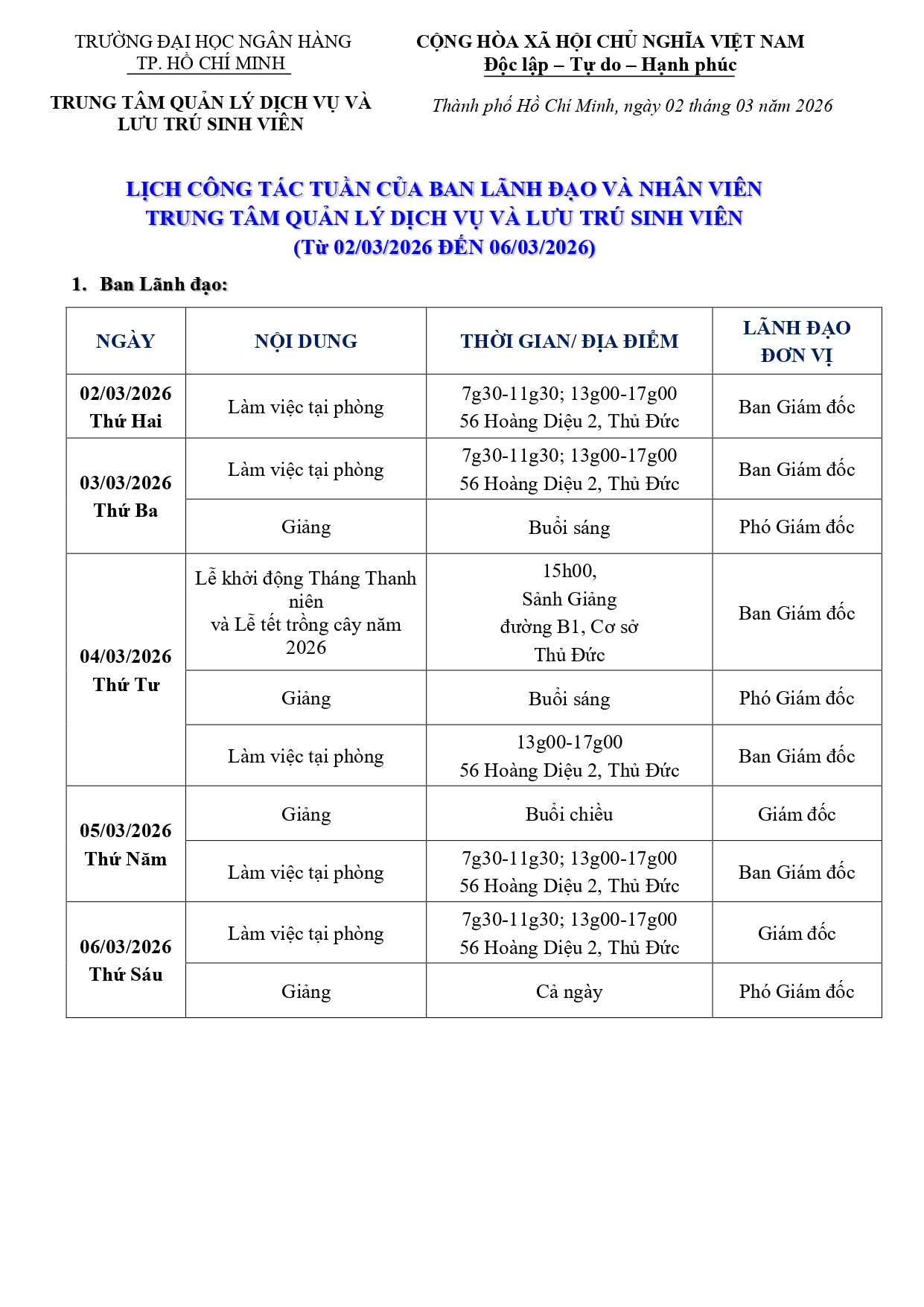 Lịch công tác tuần 9 từ ngày 02/03/2026 đến hết ngày 07/03/2026