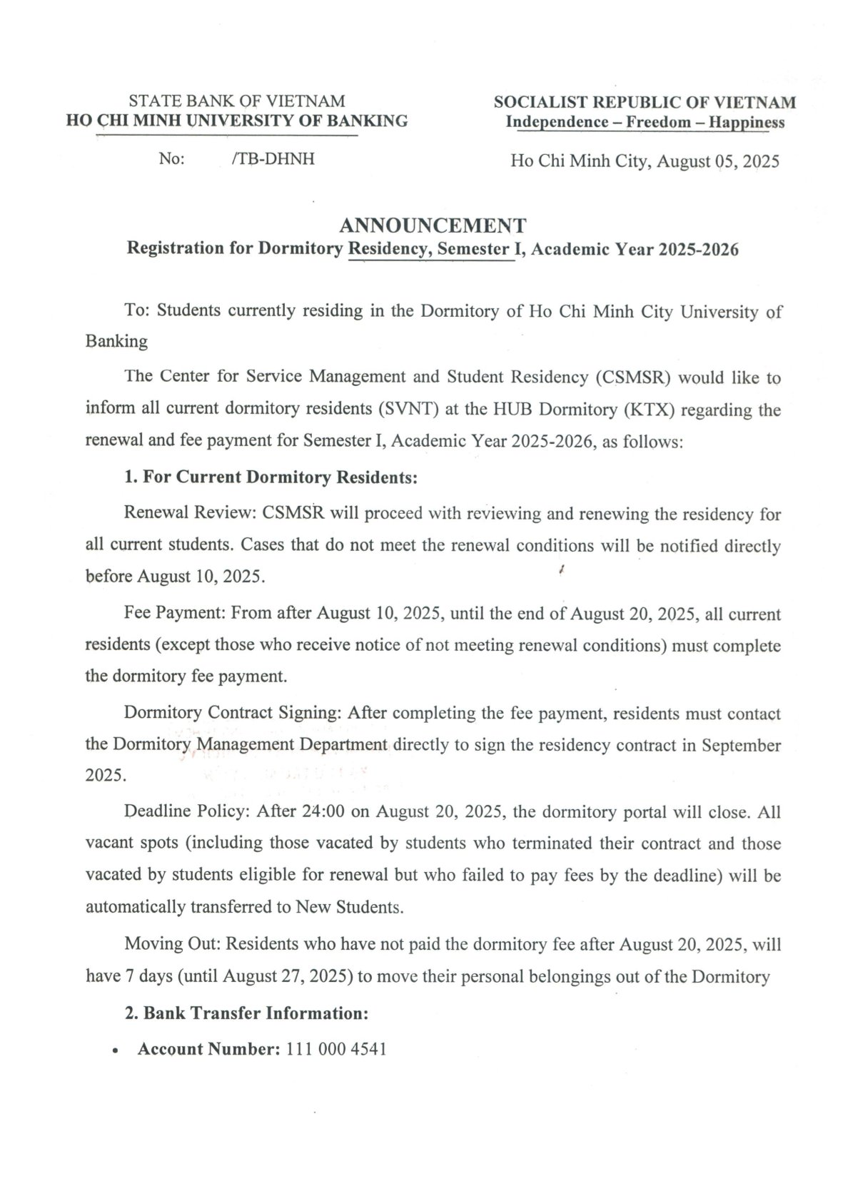 THÔNG BÁO VỀ VIỆC ĐĂNG KÝ NỘI TRÚ KỲ 1 NĂM HỌC 2025-2026