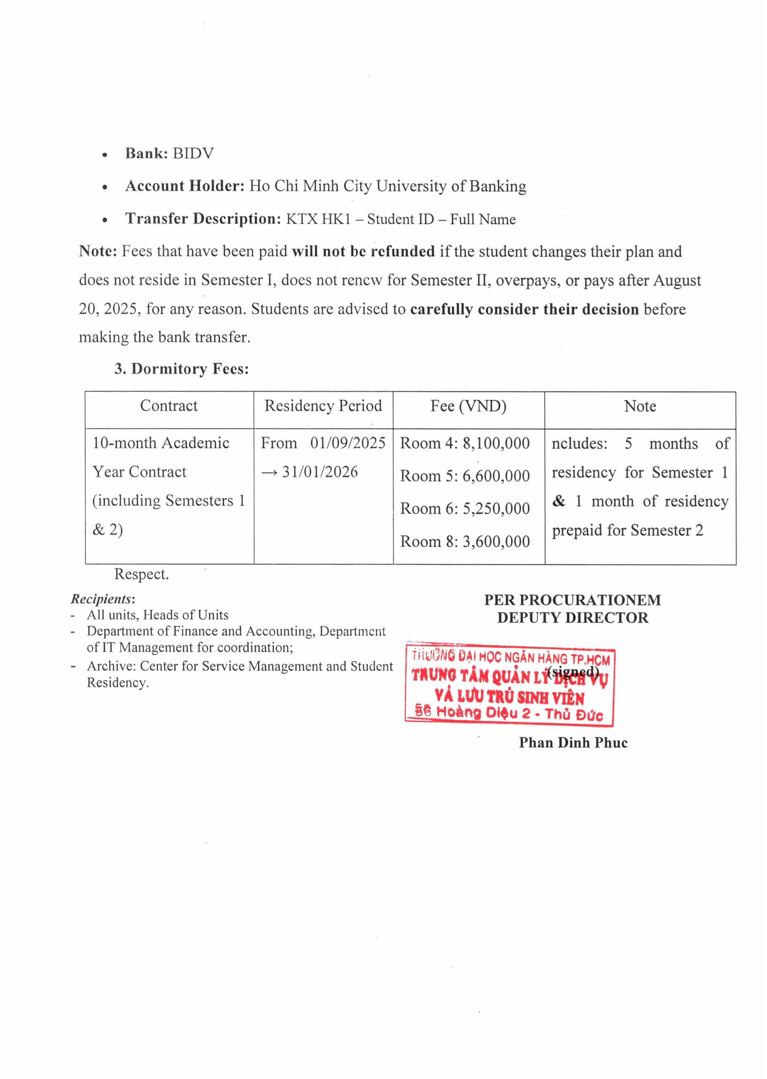 THÔNG BÁO VỀ VIỆC ĐĂNG KÝ NỘI TRÚ KỲ 1 NĂM HỌC 2025-2026